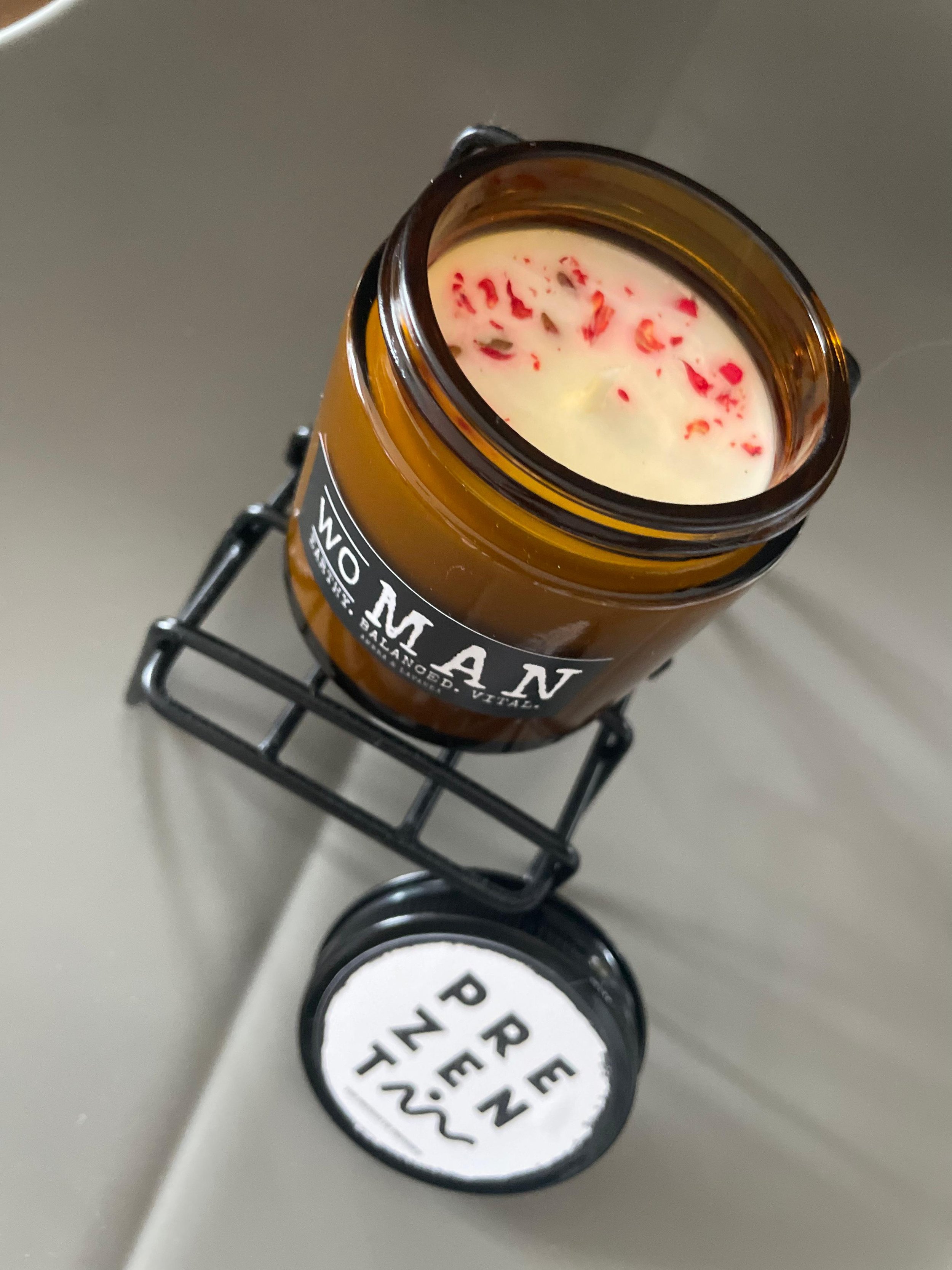 Lumanare artizanala naturala (ceara soia) cu parfum natural de lavanda si ambra. Miros: rasinos, pamantiu, floral