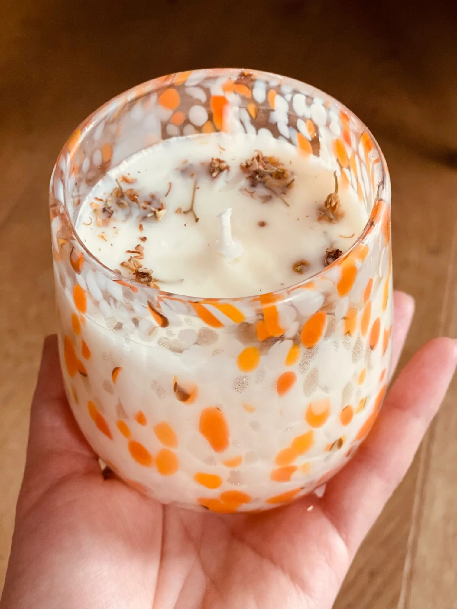 Lumanarea naturala artizanala cu flori de tei ajunge la tine in recipient de sticla de 120 / 200/ 260 grame.